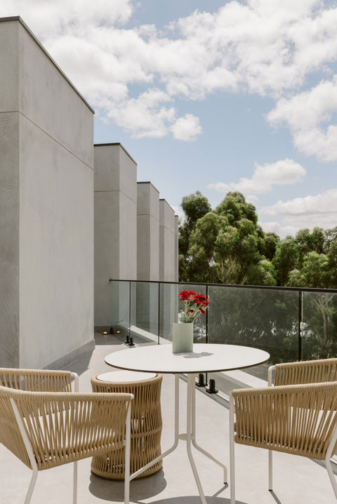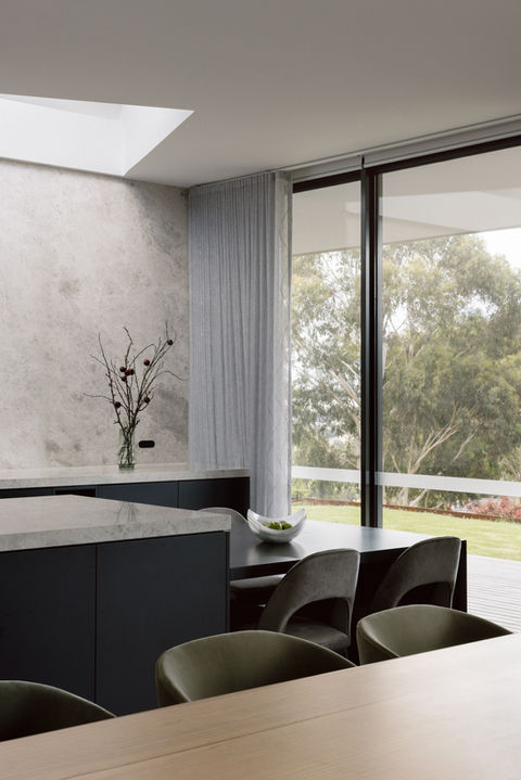 Perched on a hillside, this custom build in narre warren, melbourne is a contemporary piece of Architecture that harmonizes with its sloping terrain and lush surroundings, offering mesmerizing views. The design juxtaposes a single-story structure with a double-story mass, creating an elegant and inviting entrance through gardens, leading to a luminous open lobby. The curvilinear wall at the entrance gently guides visitors into the lobby, which opens to stunning valley vistas. An internal garden, illuminated by an angular skylight extending over the kitchen, brings life to the lobby, casting dynamic shadows throughout the day.